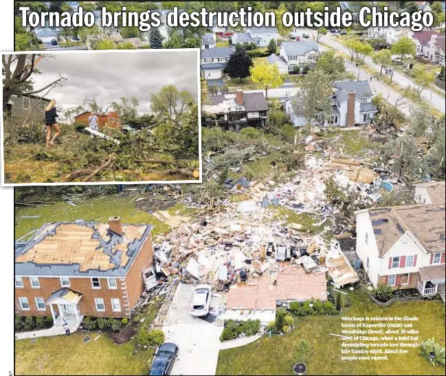 A massive storm and at least one tornado ripped through the chicago suburbs late sunday night, injuring at least five people and damaging more than 100 homes.